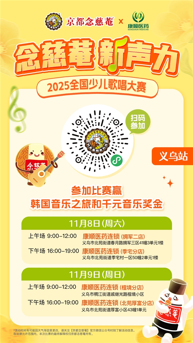 “念慈菴·新声力”全国少儿歌唱大赛可以通过线上和线下两种方式参与海选。线下海选覆盖全国 25 座城市,让热爱音乐的小朋友在家门口就能轻松圆梦!本次义乌站联合康顺医药连锁,我们把舞台搬到你的身边!无需提前预约,药店门口即可直接报名参赛,一展歌喉。家长拍摄孩子唱歌视频作品上传小程序,即视为成功参赛。勇敢站上舞台的每位小选手,都能获得京都念慈菴精心准备的定制礼品!我们更鼓励家长全程陪伴,用镜头定格孩子第一次登台的紧张与雀跃,让这场音乐之旅成为亲子共成长的珍贵回忆。