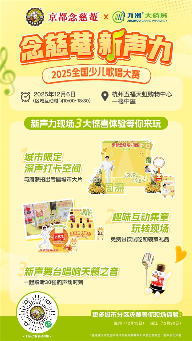百年护喉品牌京都念慈菴再度打造少儿音乐盛宴,让怀揣音乐梦想的孩子站上闪耀舞台。自9月启动以来,第三届“念慈菴新声力”少儿歌唱大赛已走过全国多座海选城市,如今,这场童声与梦想的旅程,即将迎来关键节点——杭州分区决赛将于12月6日在杭州隆重举行! 30名小歌手从同赛区的报名者中突围而出,他们将在分区决赛的舞台上展开激烈角逐,绽放音乐的魅力,争夺全国总决赛的黄金席位,向韩国音乐之旅大奖出发。